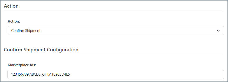 The Confirm Shipment action updates the shipment confirmation status for an order in Amazon Marketplace. This action belongs at the end of a flow.