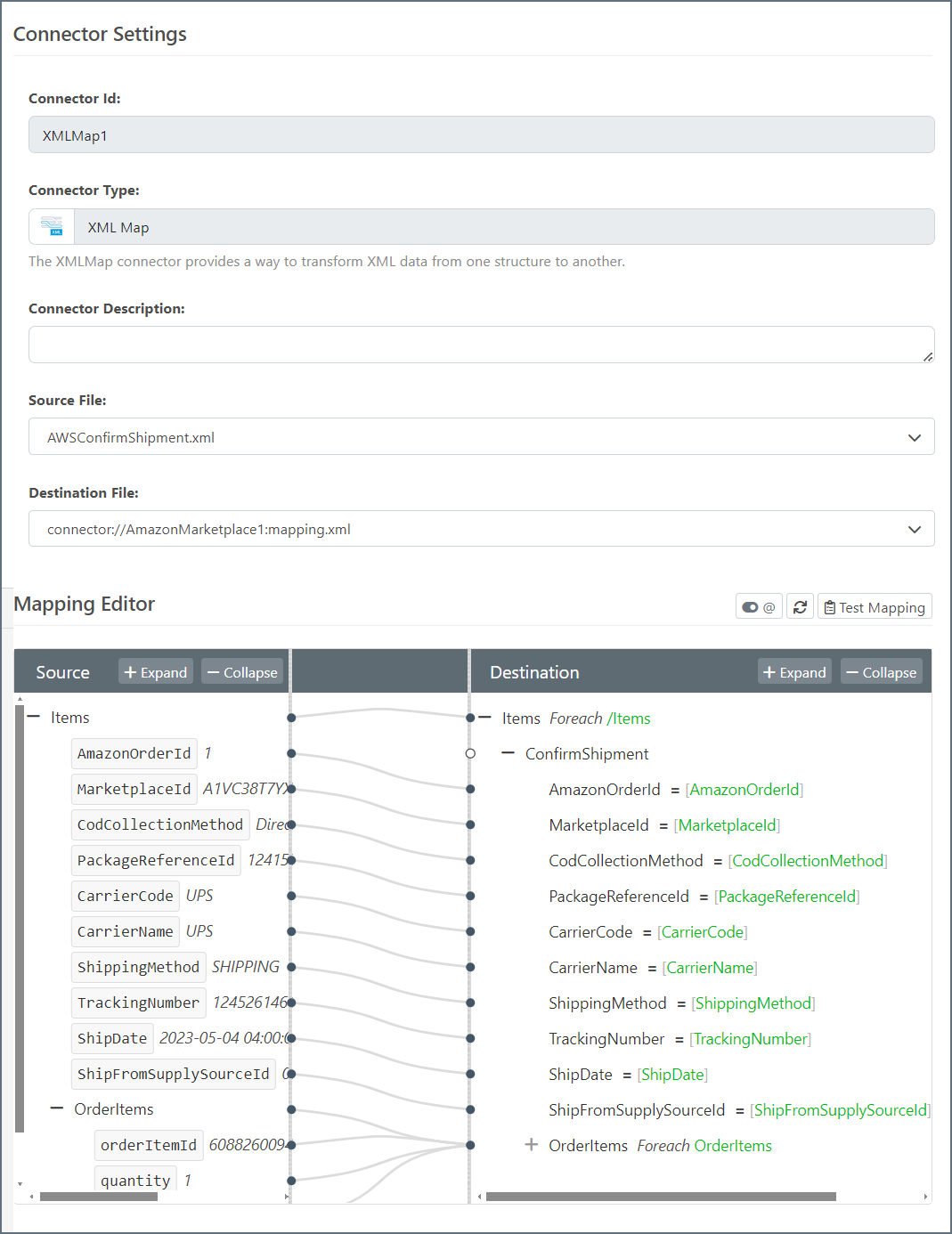 You must connect an XML Map connector to the Amazon Marketplace connector and map the shipment confirmation values. In the example below, the order information appears in the Source column, and the Amazon Marketplace shipment parameters appear in the Destination column.
