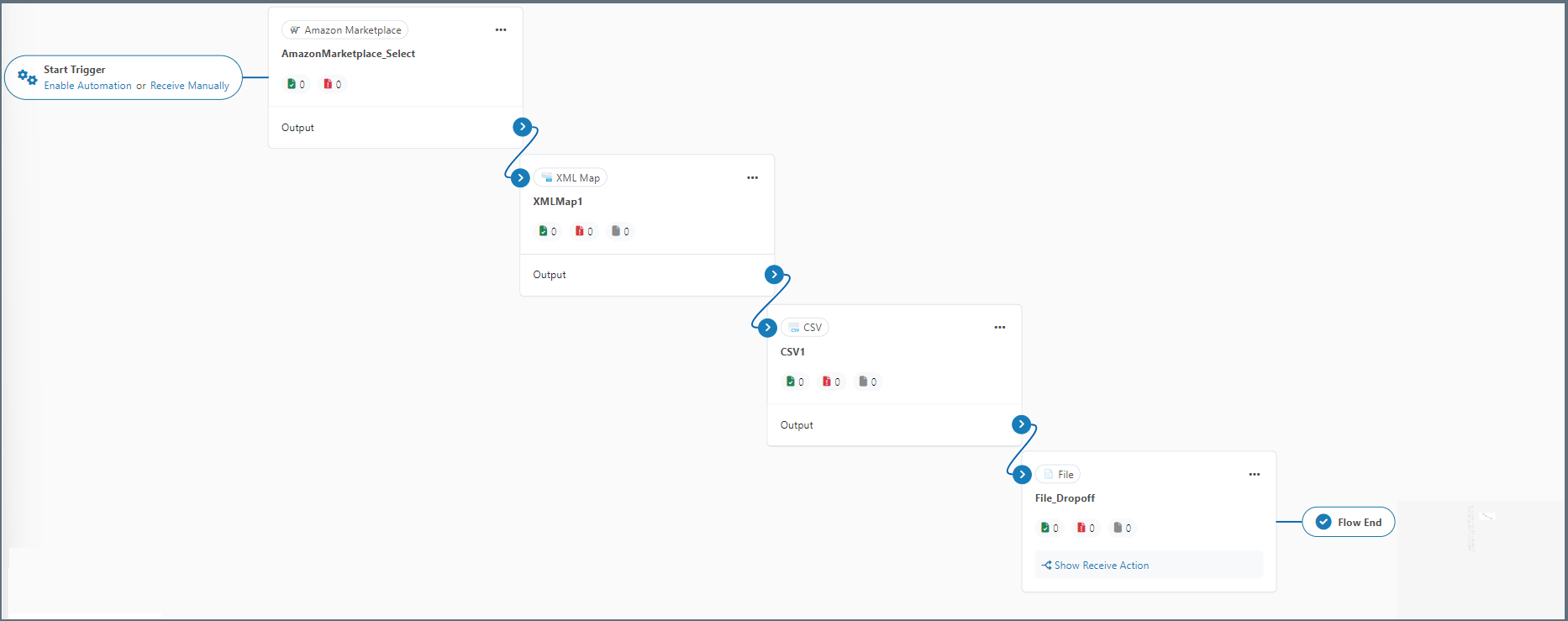 After you choose the tables and columns for the Select-configured Amazon Marketplace connector, place the connector at the beginning of an Arc flow. The screenshot below depicts an example flow with a Amazon Marketplace Select connector, an XML Map connector, a CSV connector, and a File connector at the end: