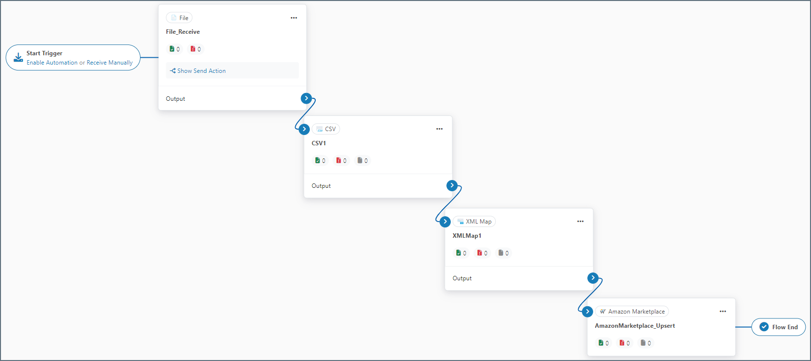 After you choose the tables and columns for the Upsert-configured Amazon Marketplace connector, place the connector at the end of an Arc flow. The screenshot below depicts an example flow with a CSV connector, an XML Map connector, and a Amazon Marketplace Upsert connector at the end: