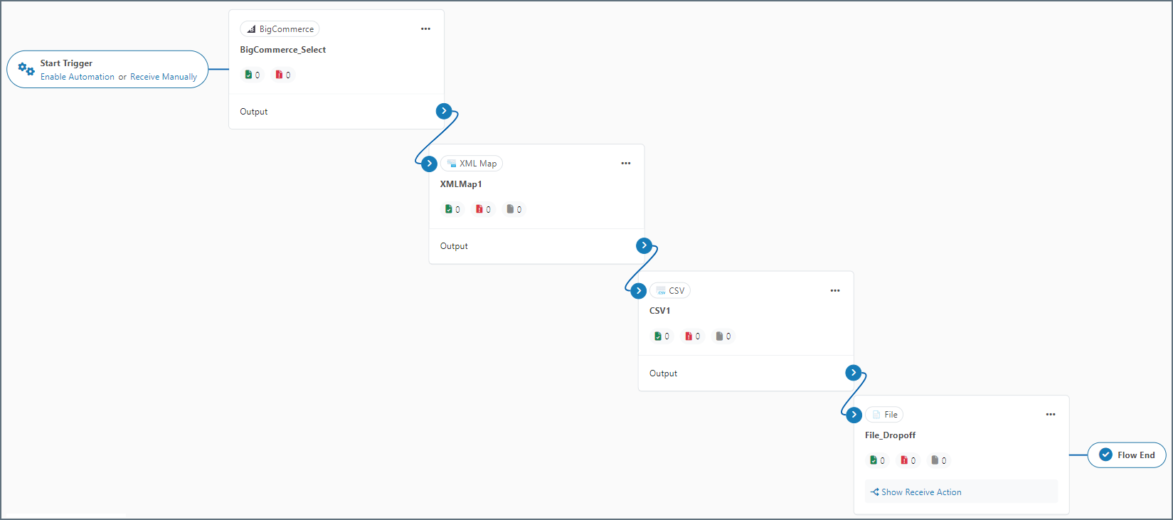 After you choose the tables and columns for the Select-configured BigCommerce connector, place the connector at the beginning of an Arc flow. The screenshot below depicts an example flow with a BigCommerce Select connector, an XML Map connector, a CSV connector, and a File connector at the end: