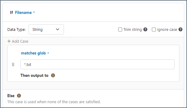 - Data Type Whether the target value is a string, number, or DateTime. If your data type is String, use the Trim string and Ignore case checkboxes to further refine the comparison. If your data type is DateTime, use the field to the right to specify how your DateTime values are structured.
