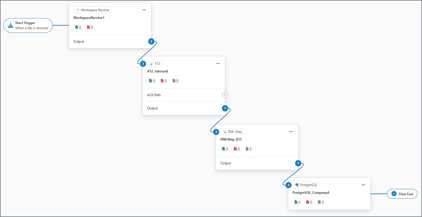 The company-specific workspaces might then contain a Workspace Receive connector to receive incoming documents (required because the Workspace Send connector was used in the Branch flow), an X12 connector with identifiers that enable translation of the raw X12 data into XML, an XML Map connector to handle mapping the XML to the destination, and finally a destination connector (PostgreSQL in the following image).