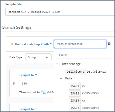 - If Use the dropdown to specify what attribute to compare when messages are received. Options are: the message header, the filename, all matching XPaths, the first matching XPath, one or more matching XPaths, or EDI metatdata. Once you make your selection, use the fields to the right to further define the condition, as shown in the Sample File image above.