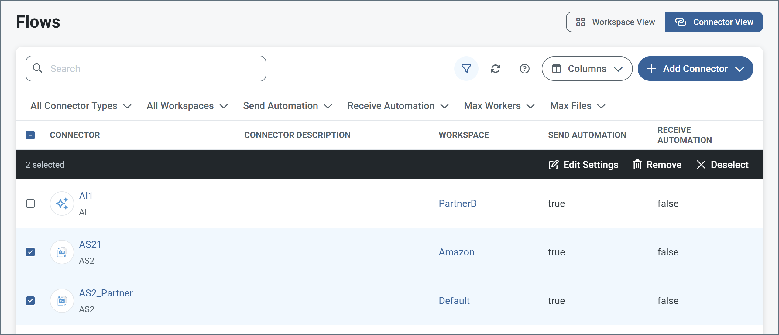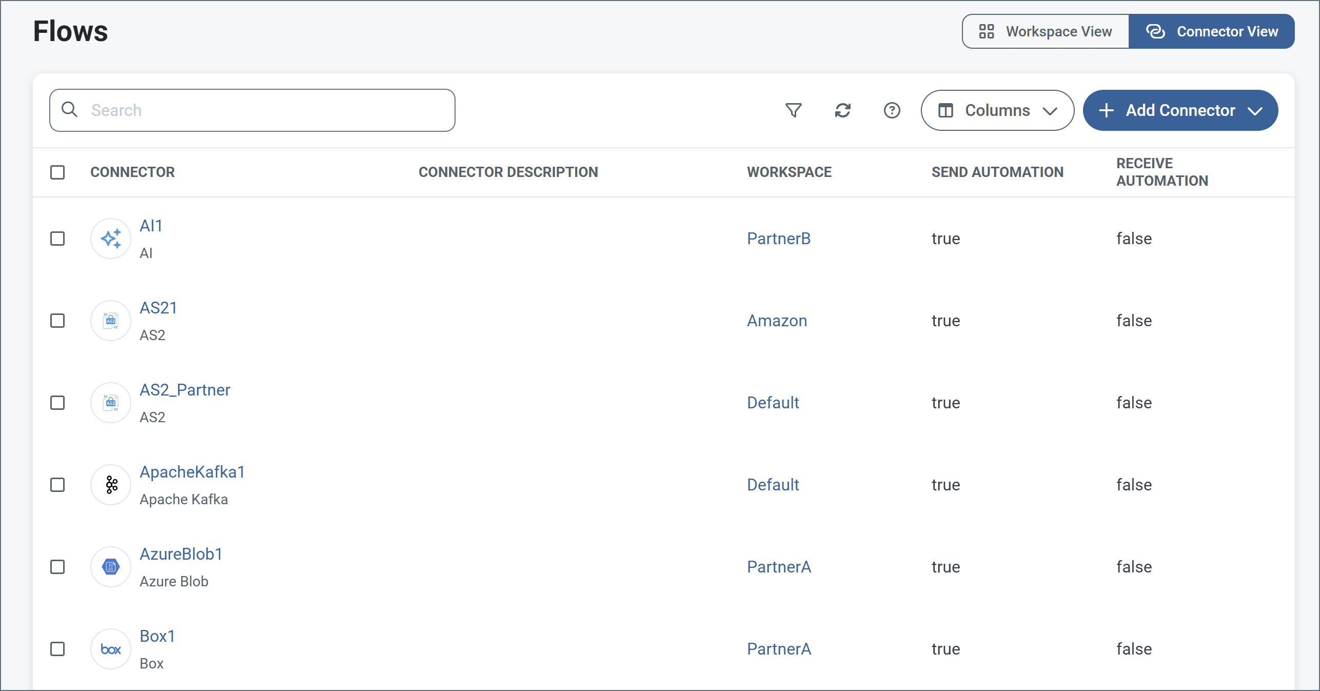 Click Flows on the navbar to open the workspaces grid, then click Connector View in the top right to see a list of all connectors in your application.