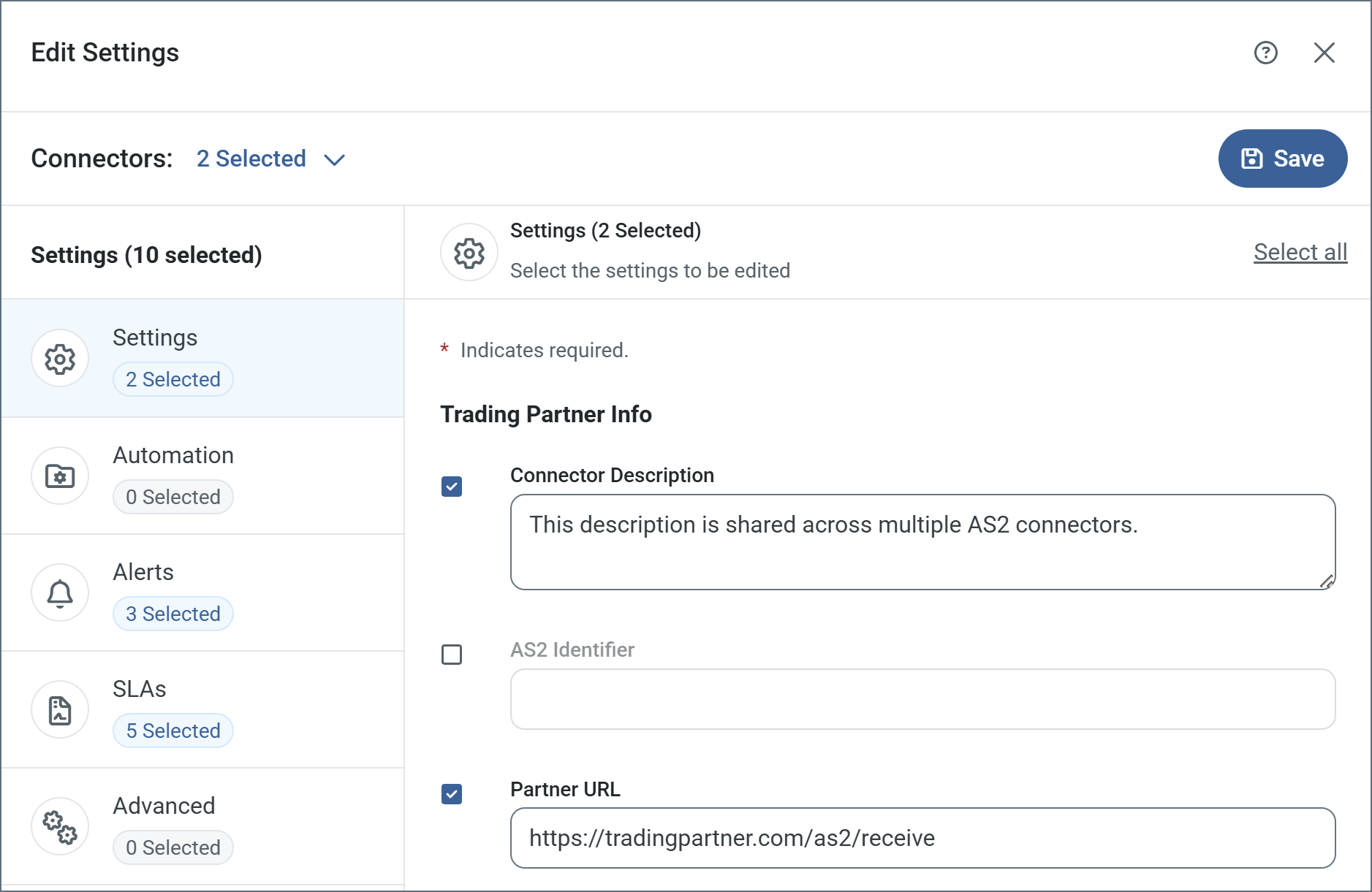 The Edit Settings page is divided into the same tabs you find when you create individual connectors. Use the checkboxes on all the tabs to select which fields to edit, then make your edits. When you are finished, click Save. When you save, Arc validates your changes and reports any warnings or errors before applying the changes to the selected connectors.