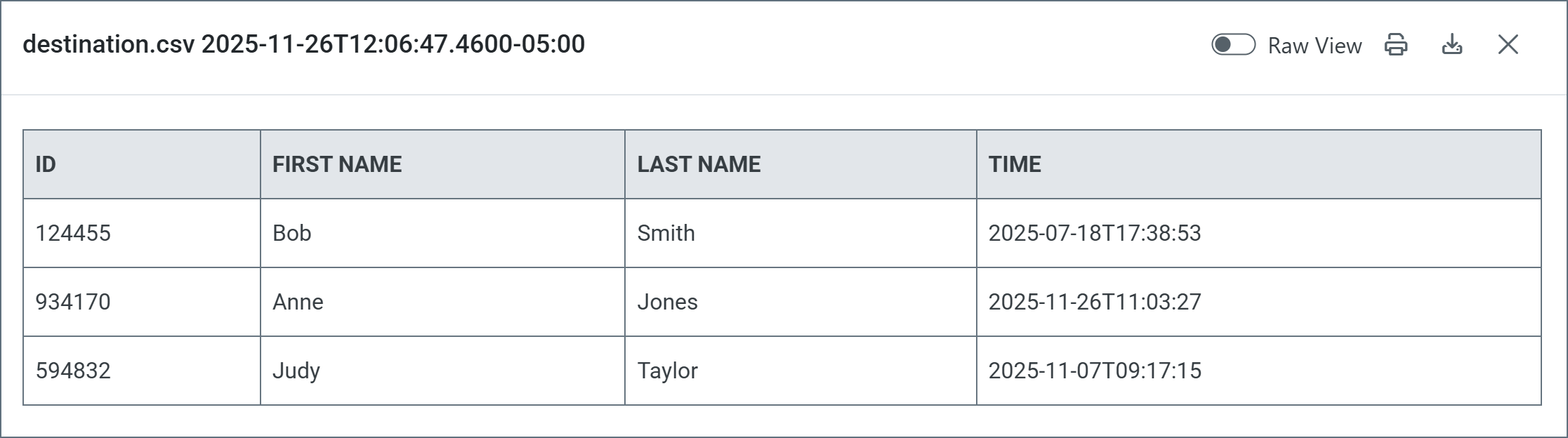 When you view a CSV document on the connector Transactions tab, you can view it in a print preview format, or as the raw data. By default, the document is shown in the preview format, as shown in the following image: