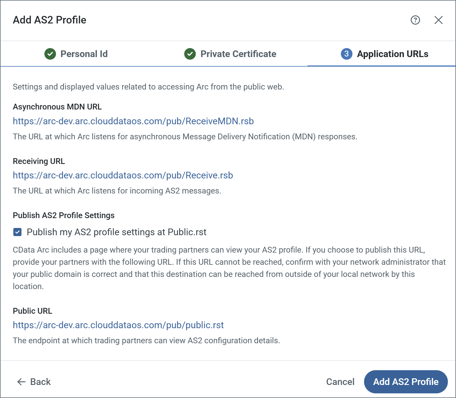 If you check AS2 プロファイル設定をPublic.rst に公開する, trading partners can view your AS2 profile details at the endpoint shown in パブリックURL. Sending your trading partners this URL can simplify the process of exchanging AS2 configuration details.
