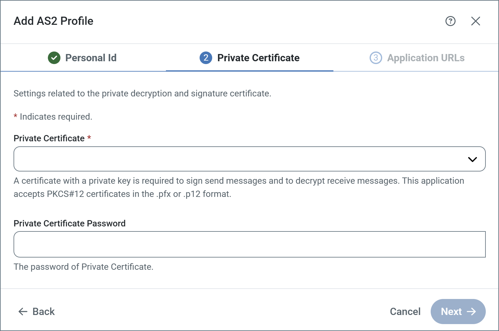 Your private certificate is used for digital cryptography (decryption and digital signatures). The private certificate contains a private key that is paired with your public encryption key. When a trading partner uses your public encryption key to secure an AS2 message, it ensures that only you can decrypt the message (with the paired private key).