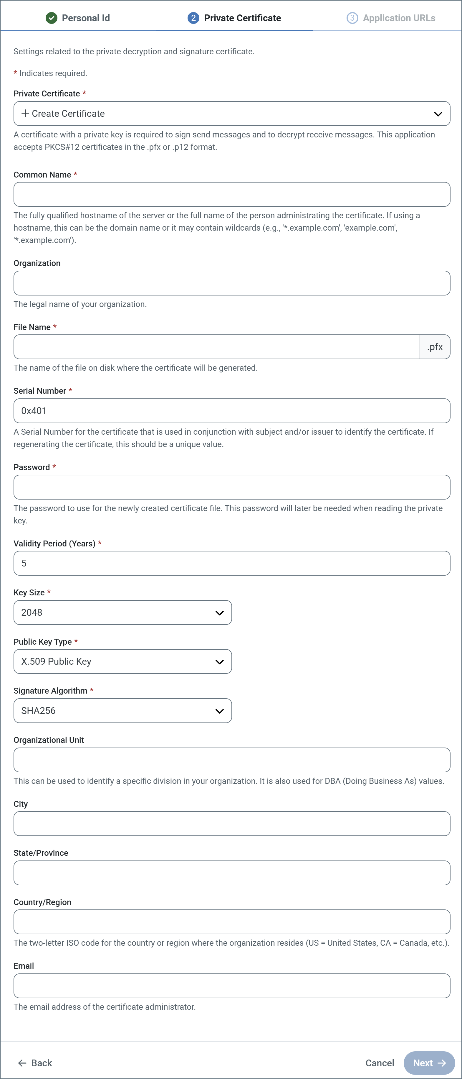- Private Certificate (the certificate that is used to decrypt incoming messages and sign outgoing messages)