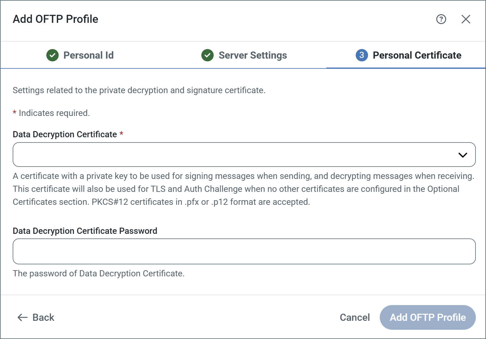 Your personal certificate is used for digital cryptography (decryption and digital signatures). The Data Decryption Certificate is a certificate with a private key that is paired with your public encryption key. When a trading partner uses the public key of your Data Decryption Certificate to secure an OFTP message, it ensures that only you can decrypt the message (with the paired private key).