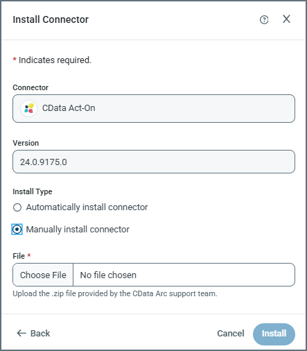 After you click the download button, the Install Connector pane opens and specifies the version number. At this point, it asks whether you want to install manually or automatically. Typically you want to install automatically. However, if CData Support has provided you with a .zip file, you can select manual, then use Choose File to supply the .zip file from them.
