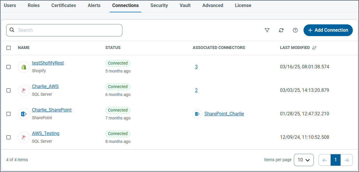 接続タブには、複数のCData Arc コネクタ間で共有できる構成済みの接続パラメータがリストされます。これにより、同じ認証情報を使って同じソースに接続する個々のコネクタ内での接続管理の一元化と設定の簡素化が可能になります。