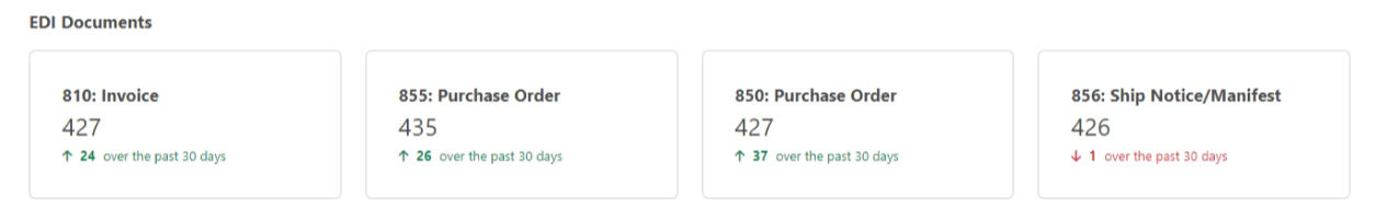 [EDI ドキュメント]セクションは、EDI トランザクションの種類で追跡をオプトインした場合にのみ表示されます。トランザクションの種類で追跡チェックボックスは、一部のEDI コネクタの高度な設定タブにあります。有効化すると、アプリケーションはトランザクションの種類をメッセージの追跡ヘッダーとして追加します。ダッシュボードでは、2種類から8種類のドキュメントの傾向に対するインサイトが得られます。このウィジェットを編集して、表示するEDI ドキュメントの種類を選択することが可能です。このセクションをダッシュボードから削除するには、非表示チェックボックスをクリックします。