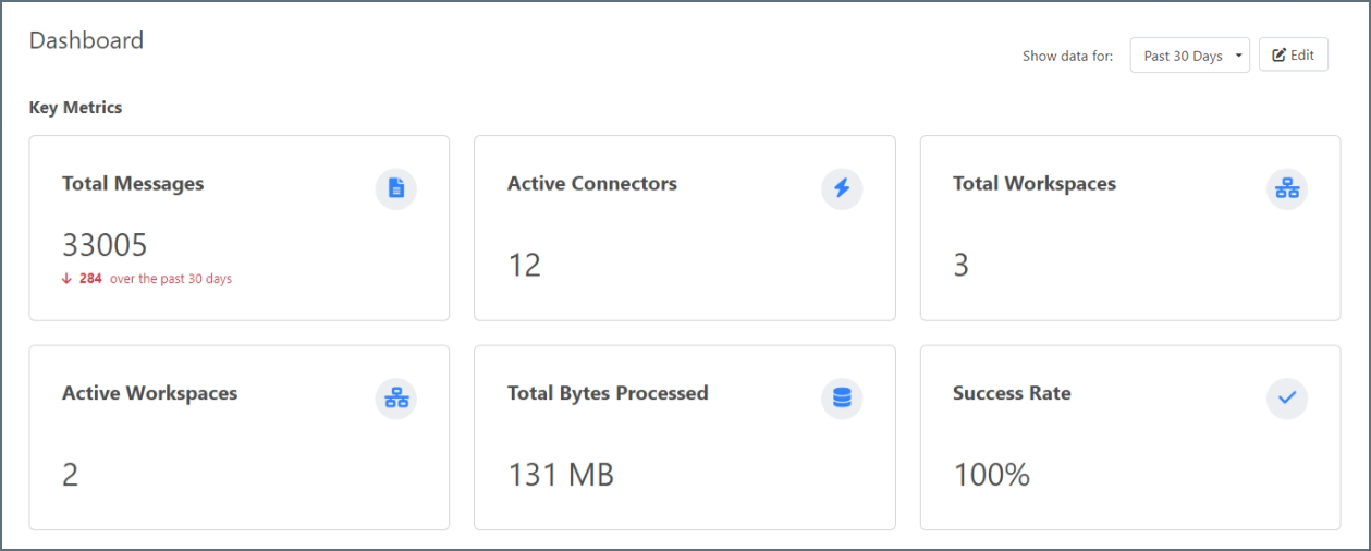 ダッシュボードはCData Arc のランディングページです。デフォルトでは、過去7日間のメトリクスを表示しますが、次のデータを表示 ドロップダウンを使用して期間を選択できます。以下のオプションがあります。
