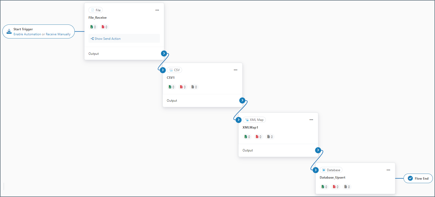 After you choose the tables and columns for the Upsert-configured Database connector, place the connector at the end of an Arc flow. The screenshot below depicts an example flow with a CSV connector, an XML Map connector, and a Database Upsert connector at the end: