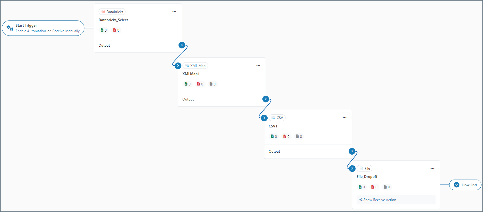 After you choose the tables and columns for the Select-configured Databricks connector, place the connector at the beginning of an Arc flow. The screenshot below depicts an example flow with a Databricks Select connector, an XML Map connector, a CSV connector, and a File connector at the end: