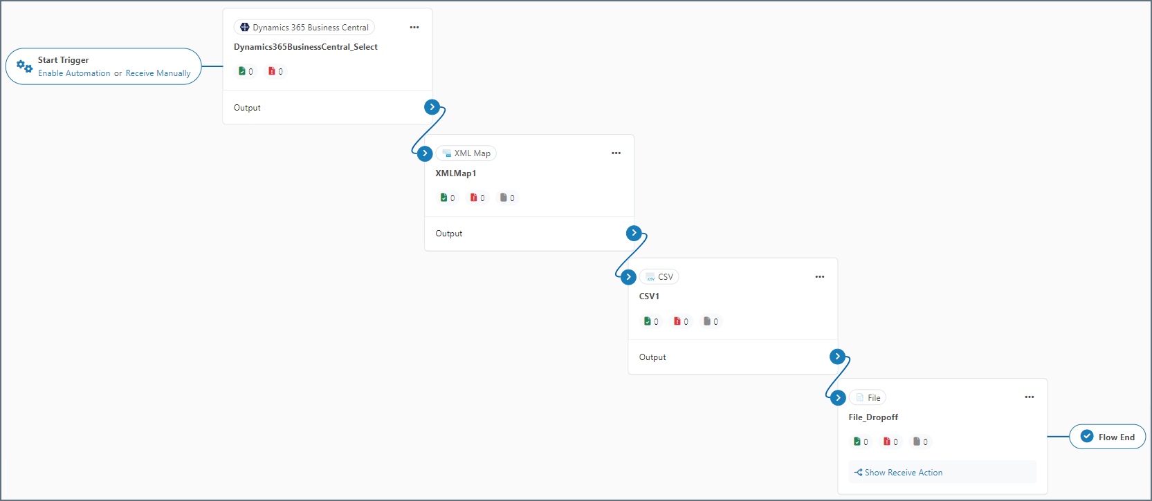 After you choose the tables and columns for the Select-configured Dynamics 365 Business Central connector, place the connector at the beginning of an Arc flow. The screenshot below depicts an example flow with a Dynamics 365 Business Central Select connector, an XML Map connector, a CSV connector, and a File connector at the end: