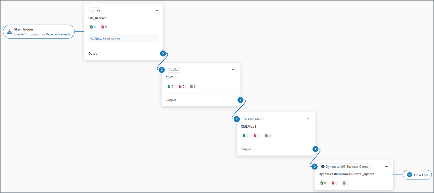 After you choose the tables and columns for the Upsert-configured Dynamics 365 Business Central connector, place the connector at the end of an Arc flow. The screenshot below depicts an example flow with a CSV connector, an XML Map connector, and a Dynamics 365 Business Central Upsert connector at the end: