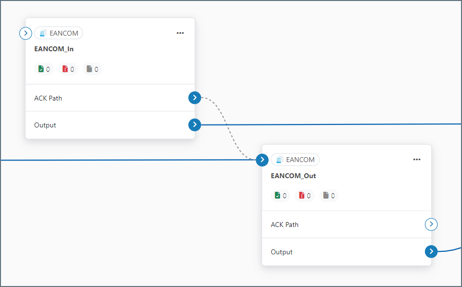When interchange and functional EANCOM acknowledgments are received at an EANCOM connector in EDI-to-XML mode, the connector can be configured to automatically route any detected acknowledgments to the EANCOM connector that first generated the transmission. In the flow diagram, drag the grey circle from the receiving (EDI-to-XML) EANCOM connector onto the originating (XML-to-EDI) EANCOM connector.