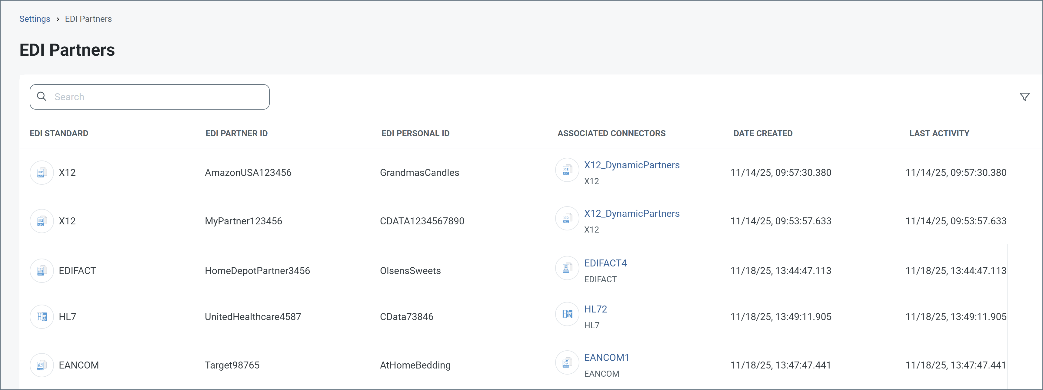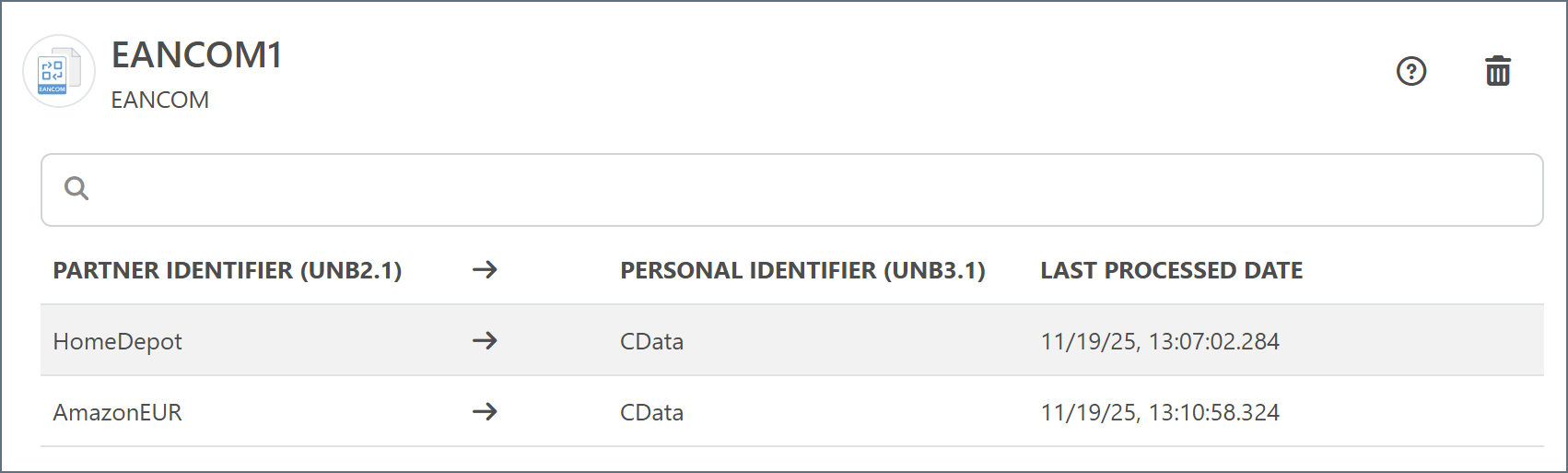 The EDI Partners tab in the connector’s configuration tabs is only enabled when Arc is dynamically processing partners. It is populated with the partner and personal identifiers of each relationship that the connector identifies, as well as the last processing date of a file for that partner. You can delete partners whose last processed date is more than 30 days ago in the EDI Partners tab by hovering over the partner and clicking the bin icon.