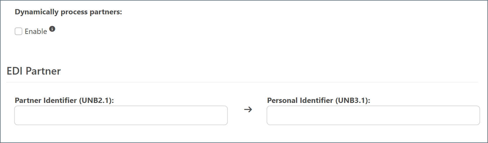 - Dynamically process partners When enabled, the connector automatically identifies and tracks trading partner relationships from EDI transactions. When disabled, you must manually define the partner relationship. See Defining Trading Partner Relationships for more information.