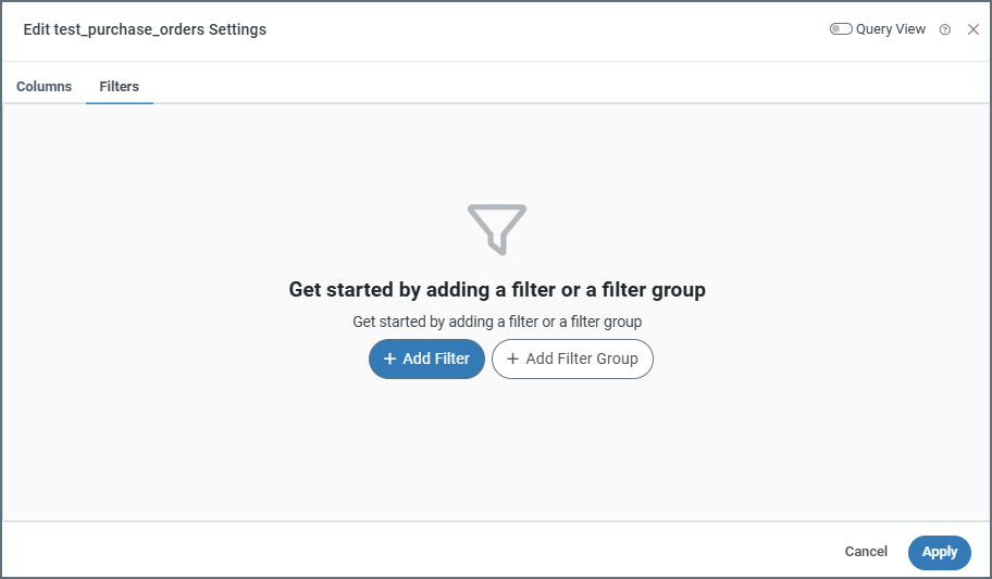 If you need to filter the data that the connector selects in a source table structure, click the ellipses and choose Table Settings, then click the Filters tab. The Edit <TableName> Settings window opens, where you can define individual filters and filter groups.