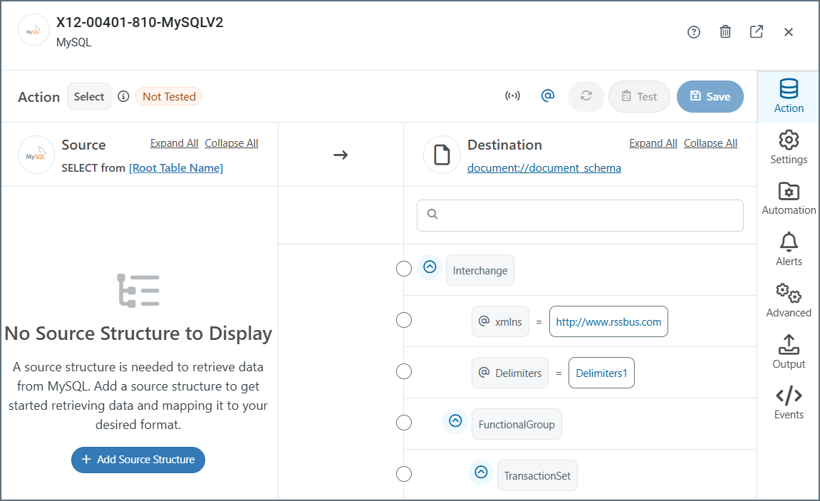 Once you have established the connection, you must select the table(s) that you need to map. If you’re creating an incoming document, click Add Destination Structure. If you’re creating an outgoing document, click Add Source Structure. This example shows adding a destination structure.