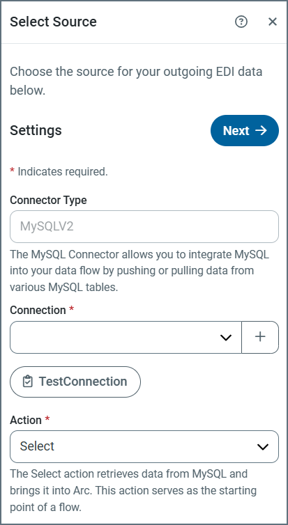 Select, so when you have added and tested your connection, click Next. (The action for an incoming document isUpsert. See Actions for more information.)