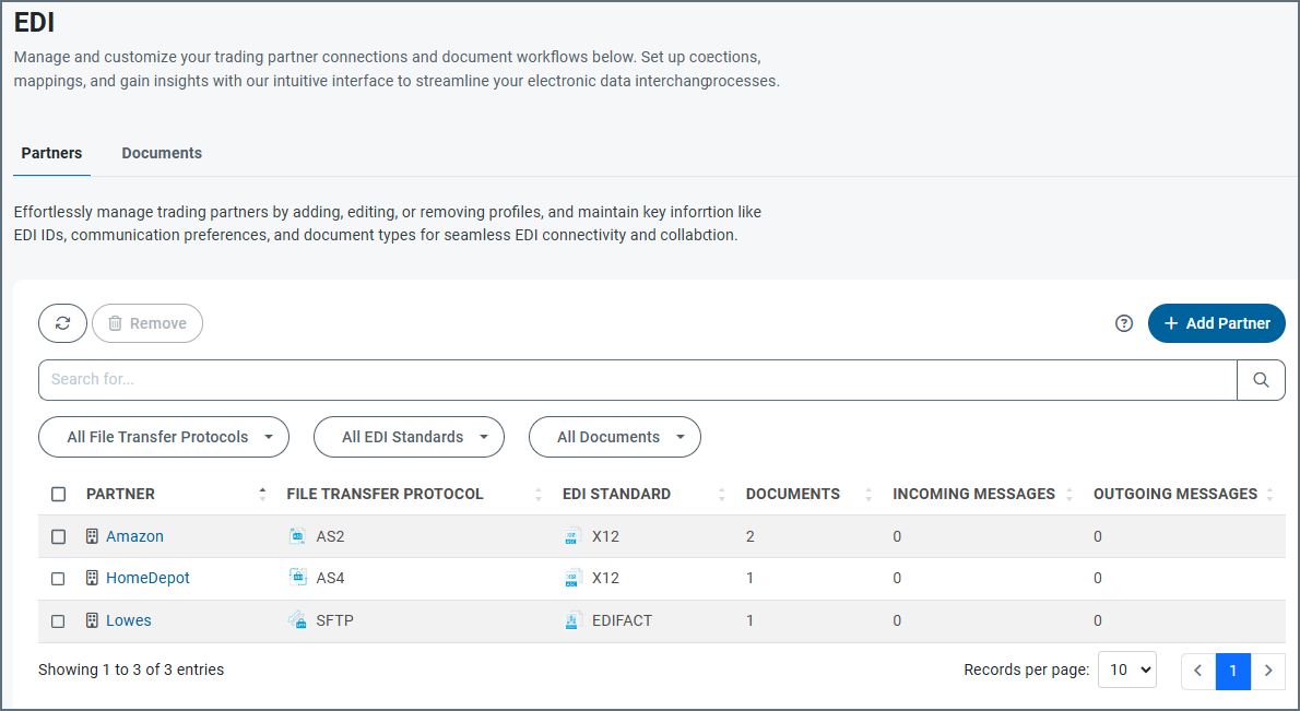 The Partners tab contains a list of all trading partners you have defined, the file transfer protocol used by that partner, the EDI standard, the number of documents and a count of incoming and outgoing messages.