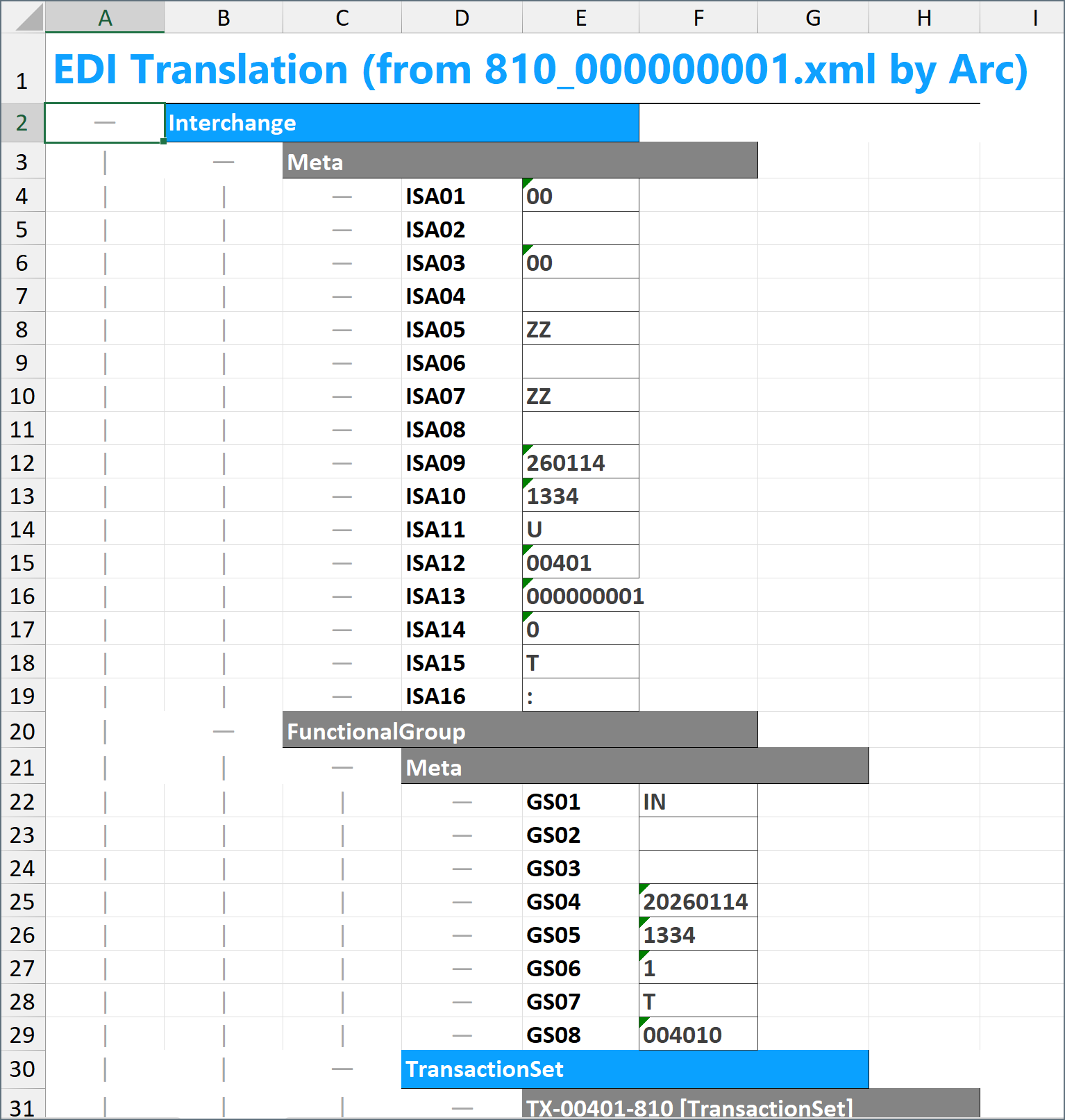 The Excel connector generates XML representing the EDI document. The following is a portion of the X12 810 document in XML: