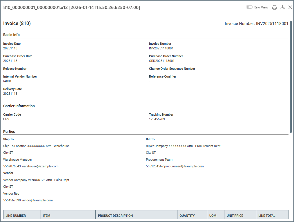 The X12 connector converts this XML into EDI format and applies interchange headers according to the Interchange Settings in the X12 connector. The final output should look similar to this (by default it opens in Print View, but you can use the Raw View toggle to see the raw data):