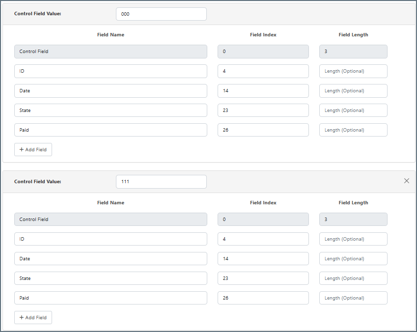 Once each possible line type has been added and identified using a specific Control Field Value, the fields that appear in each line type should be specified along with the position in the line where they begin.