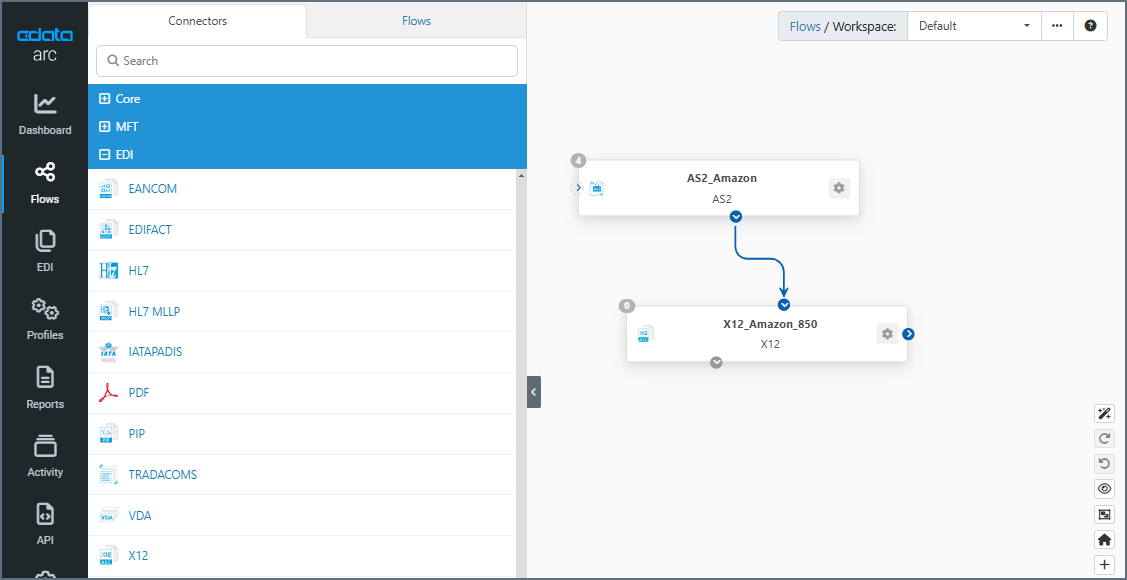 The Flows page enables you to create data-processing workflows by linking connectors together in logical sequences. The screenshot below shows a simple flow that links an AS2_Amazon connector to an X12_Amazon_850 connector: