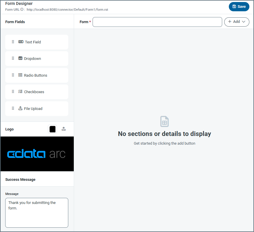 Form connectors expose a public web endpoint where clients fill out a form and submit that data into a CData Arc flow.
