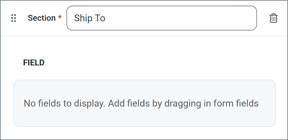 Sections divide fields in the form by categorizing them under a heading. For example, the Ship To section might contain fields like Address, City, and Zip.