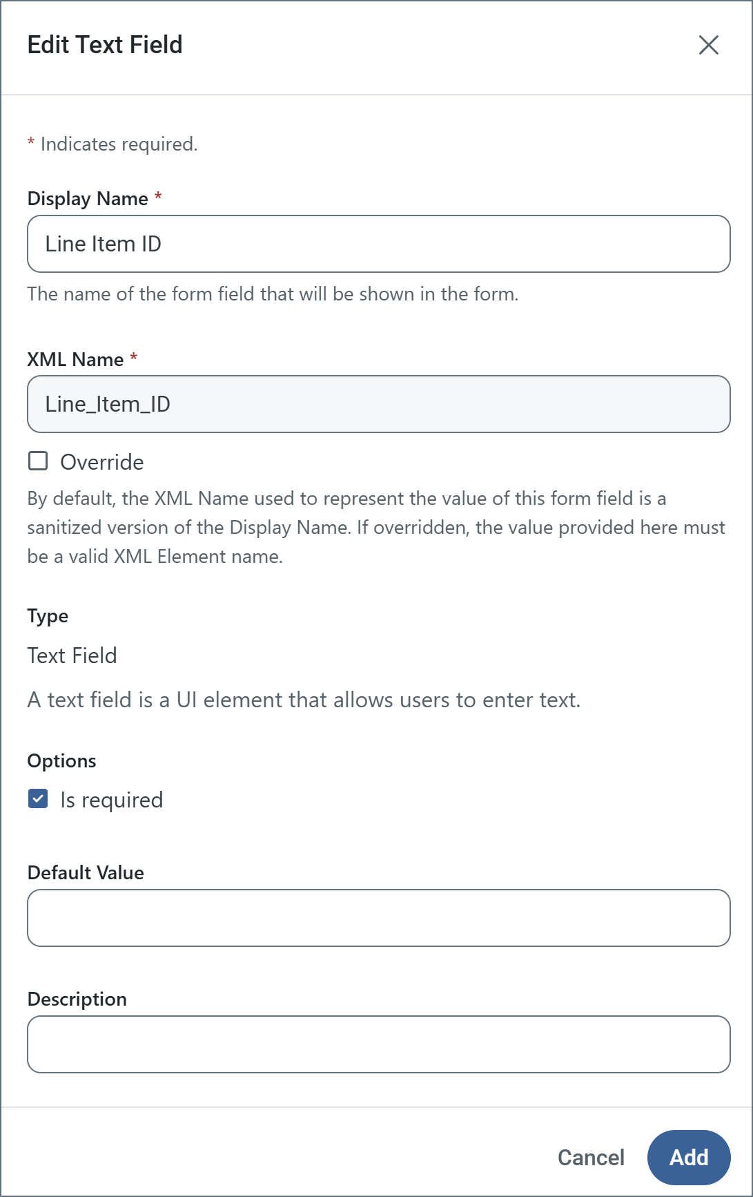Enter a Display Name (for example, Line Item Id). By default, XML Name is populated, but you can use the Override checkbox to supply a different name.