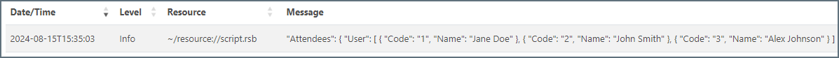 Three User entries under the /json/Event/Attendees object in the JSON data are included in the following script. The Attendees object is a subtree of the root object.