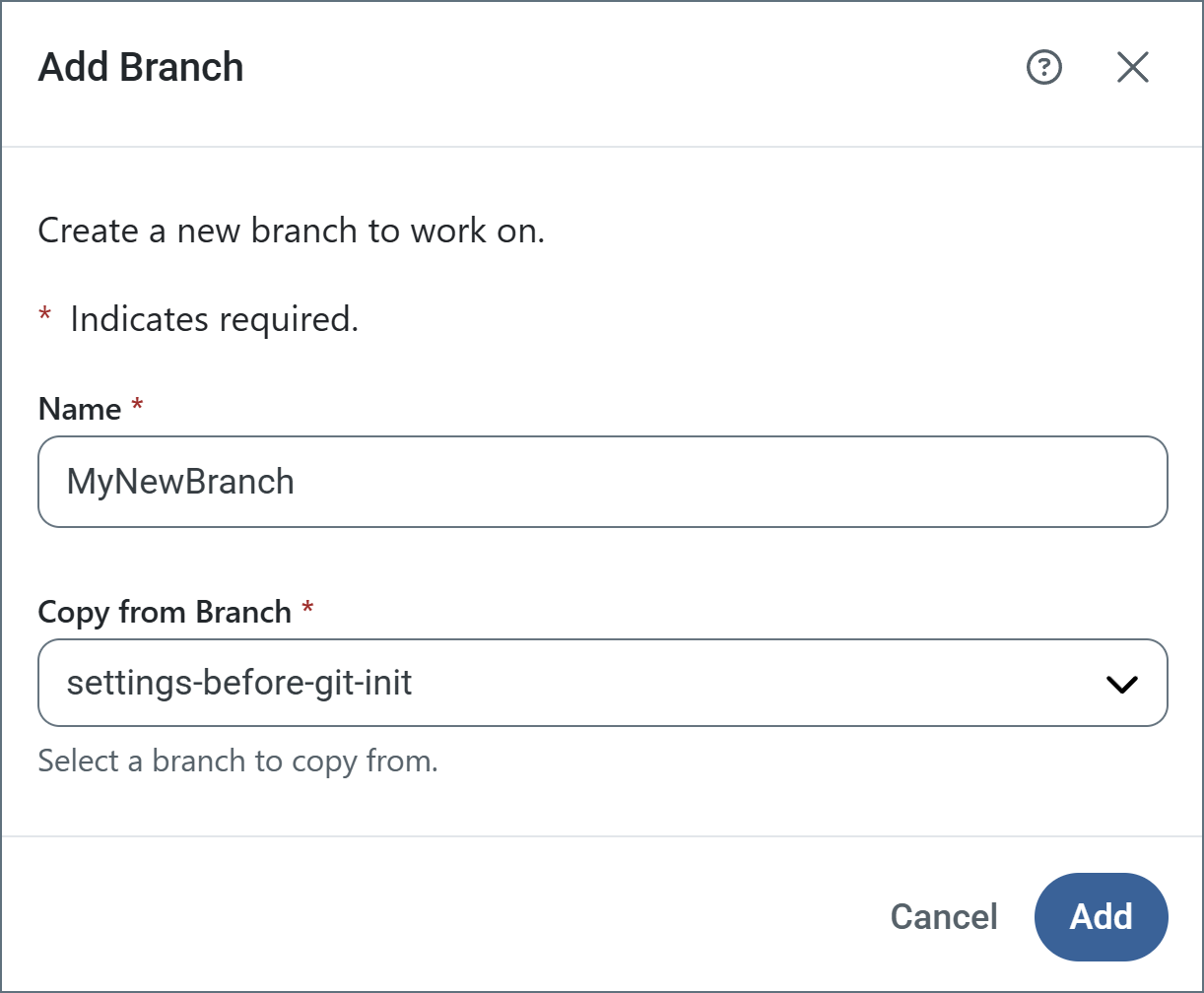 Click Add Branch and give your branch a Name. Choose which branch to copy from, then click Add.