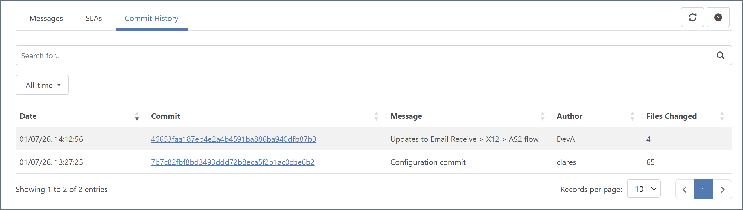 Once version control is enabled, a Commit History tab appears on the Activity tab. It shows the complete commit history and provides details such as the commit hash, commit message, author, date and time, and a list of the files that were changed in each commit. You can search and filter the content on this tab.