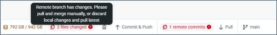 Conflicts can arise when you have local changes to push and there are also remote changes to pull. The toolbar reflects the conflicts, and provides suggestions on how to proceed. The same error messages also appear on the Commit and Pull Remote Commits preview pages.