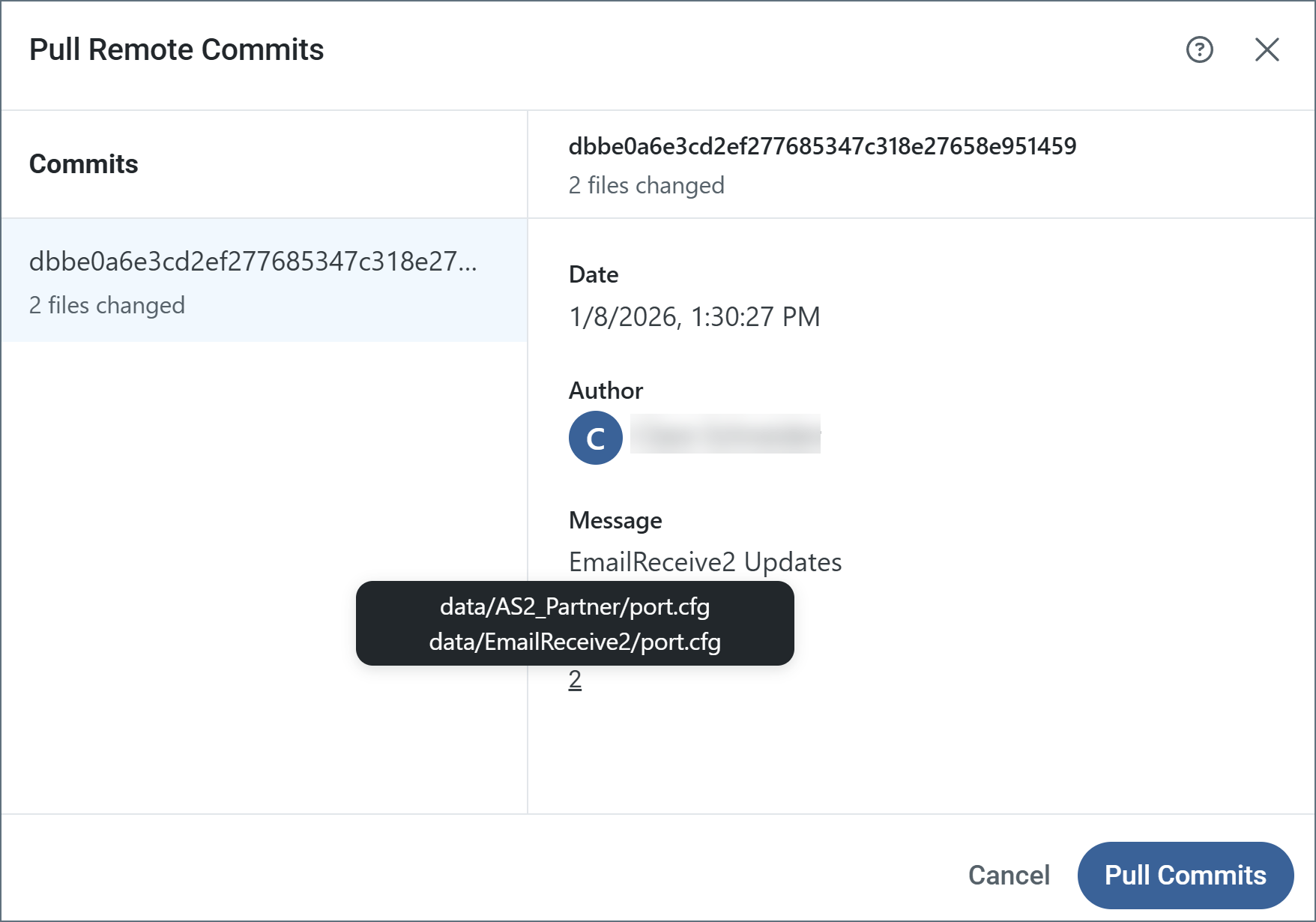 The Pull Remote Commits preview lists all commits that are ready to be pulled. Click a commit to see its details, then hover over the number of files to see which files are included in the commit. To complete the task, click Pull Commits.