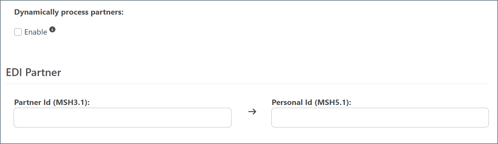- Dynamically process partners When enabled, the connector automatically identifies and tracks trading partner relationships from EDI transactions. When disabled, you must manually define the partner relationship. See Defining Trading Partner Relationships for more information.