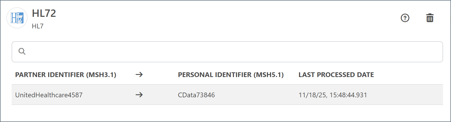 The EDI Partners tab in the connector’s configuration tabs is only enabled when Arc is dynamically processing partners. It is populated with the partner and personal identifiers of each relationship that the connector identifies, as well as the last processing date of a file for that partner. You can delete partners whose last processed date is more than 30 days ago in the EDI Partners tab by hovering over the partner and clicking the bin icon.