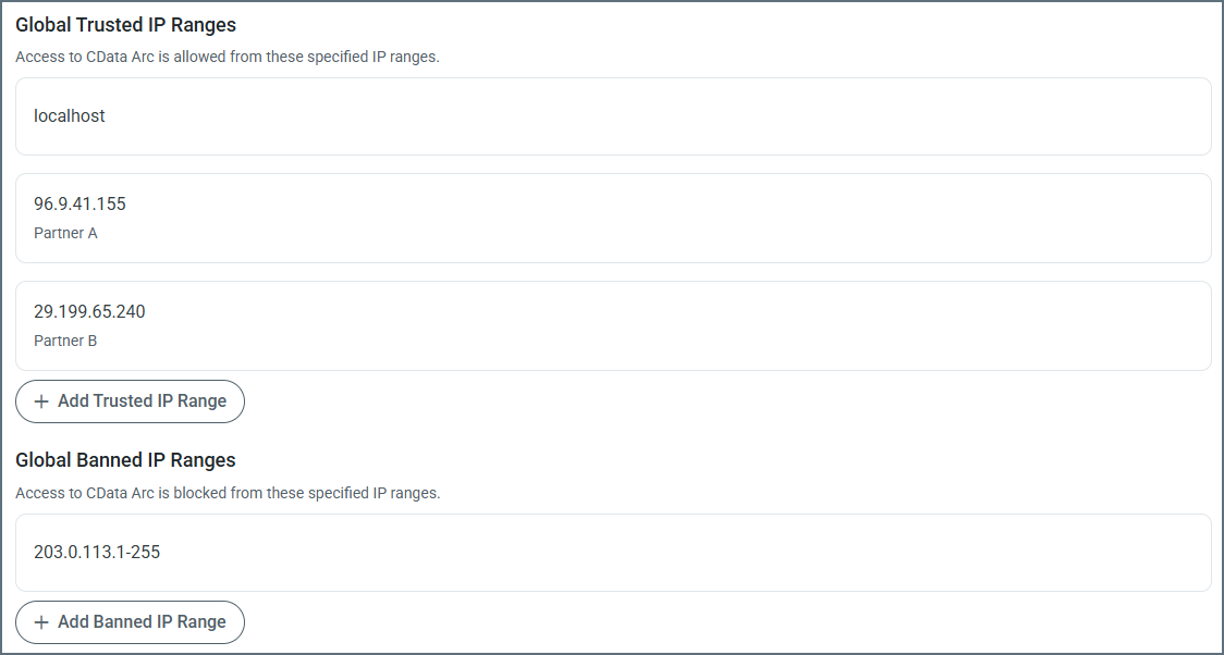 特定のIP 範囲を許可または禁止するには、信頼されたIP の範囲を追加ボタンと禁止されたIP の範囲を追加ボタンを使用します。単一のIP アドレス、単純な範囲(203.0.113.* や203.0.113.1-255 など)、またはCIDR(Classless Inter-Domain Routing)の範囲を指定できます。既存の範囲を編集するには、その上にマウスを移動し、省略記号をクリックして、編集をクリックします。