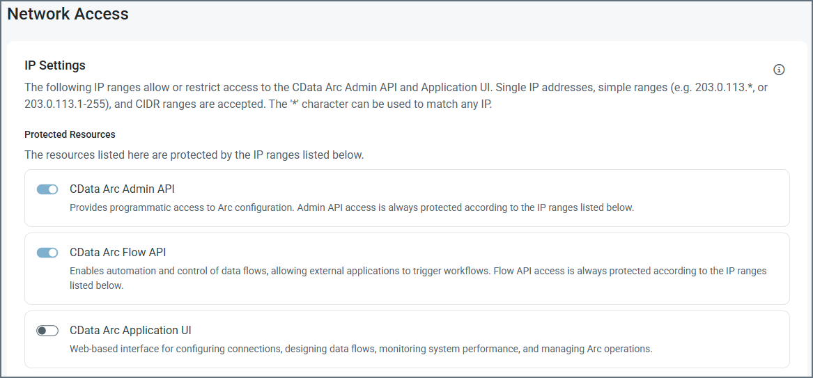 これらのネットワークアクセス設定は、CData Arc のセキュリティを強化します。IP アドレスが禁止されている場合、そのIP アドレスはアプリケーションに一切アクセスできません(ログイン、ヘルプ、管理API ページは表示されません)。Arc は、以下の優先順位リストに基づいて保護されたリソースへのアクセスを許可します: