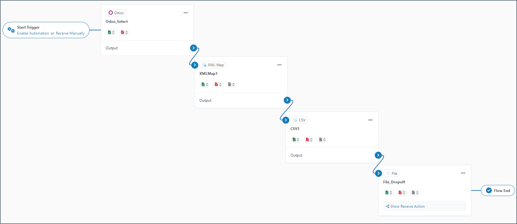 After you choose the tables and columns for the Select-configured Odoo connector, place the connector at the beginning of an Arc flow. The screenshot below depicts an example flow with a Odoo Select connector, an XML Map connector, a CSV connector, and a File connector at the end: