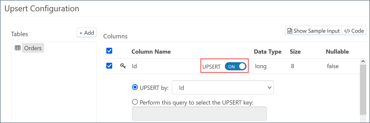 Note: If the selected UPSERT By column is not specified in the input, the lookup is used with a NULL value, as shown in the following query: