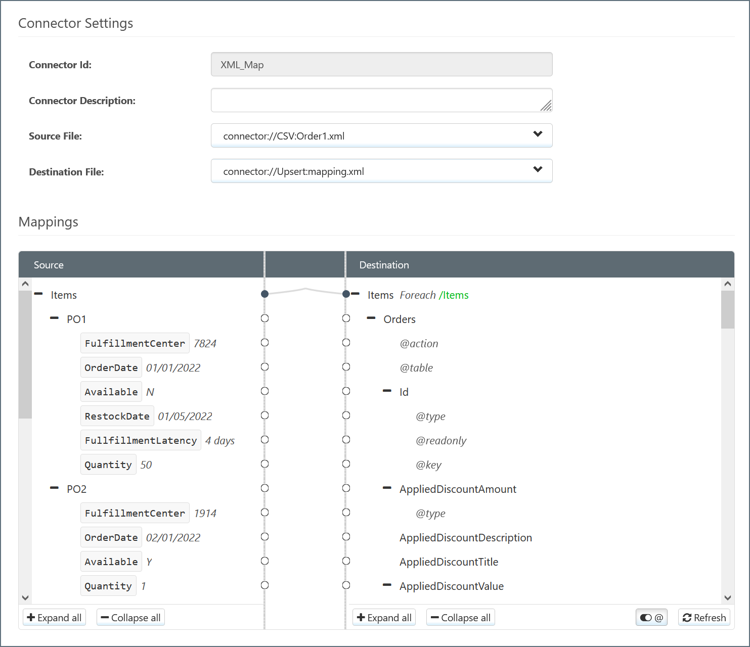 The XML_Map connector attempts to automatically map Source elements to Destination elements with the same name. You can manually change these and fill in blank mappings by dragging elements from Source to Destination.