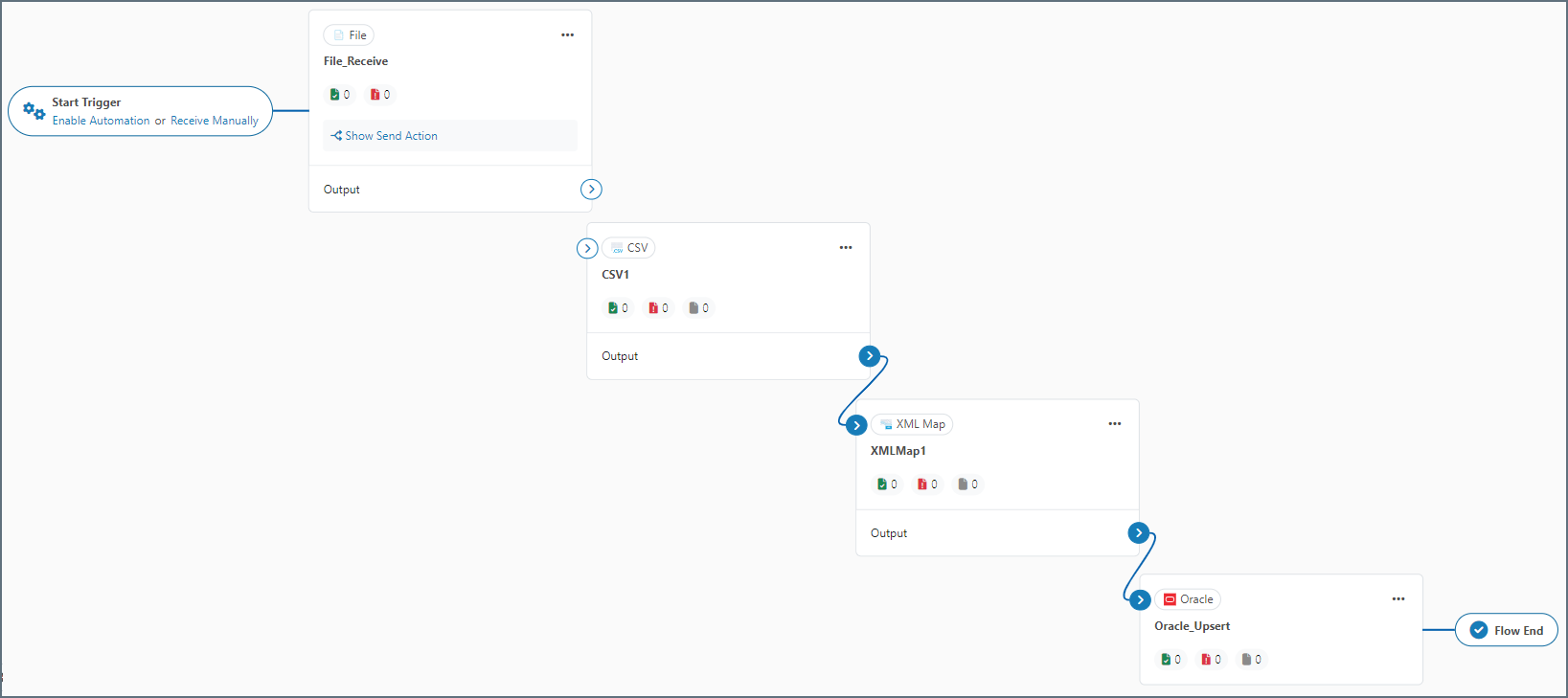 After you choose the tables and columns for the Upsert-configured Oracle connector, place the connector at the end of an Arc flow. The screenshot below depicts an example flow with a CSV connector, an XML Map connector, and a Oracle Upsert connector at the end: